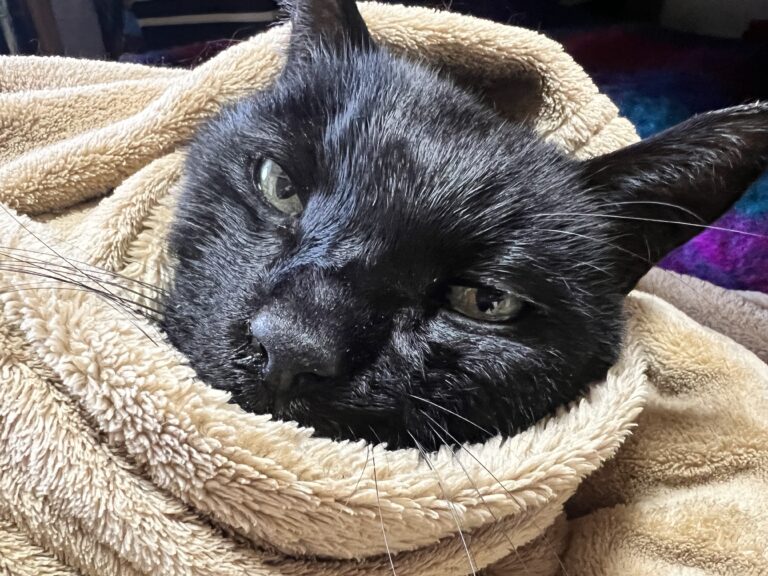↑ベッドの上に飛び乗ることができなくてベッド下で毛布にくるまる銀